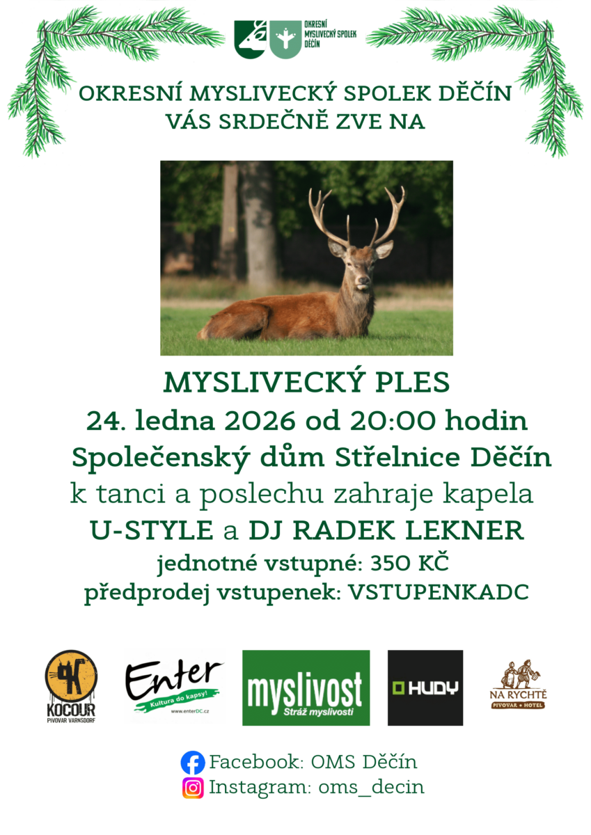 Myslivosti zdar, Myslivecký spolek Děčín Vás 24. Ledna 2026 zve na Myslivecký ples, který se bude konat v Společenském domě střelnice.
