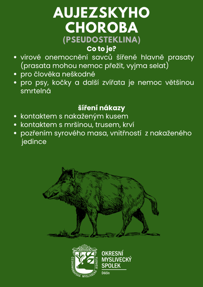 Myslivosti zdar, bohužel se na několika místech na Děčínsku potvrdil pozitivní výskyt černé zvěře s Aujezskyho chorobou zde jsou vypsané základní informace o této chorobě.